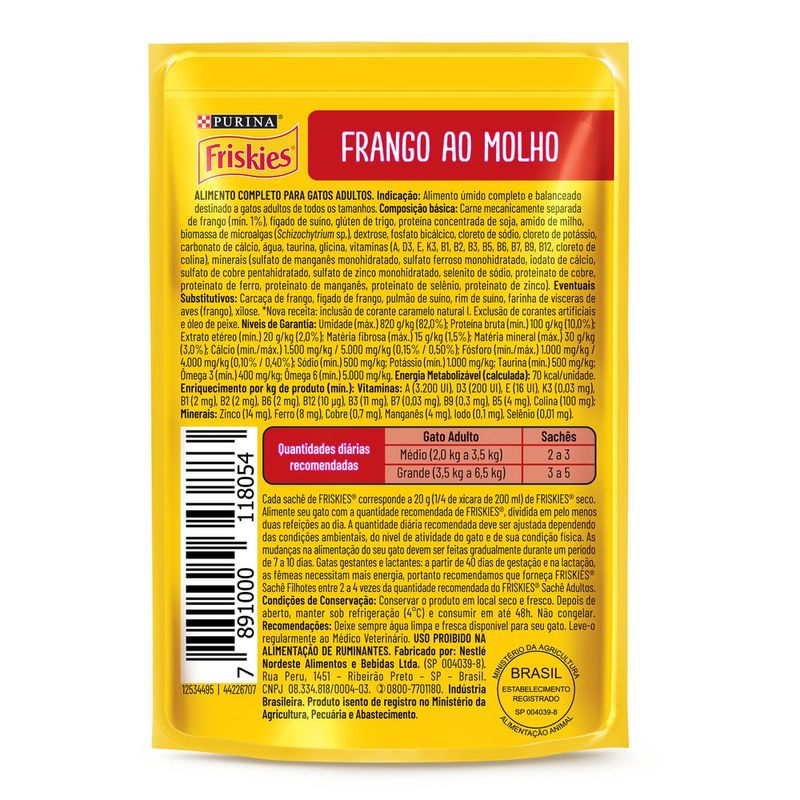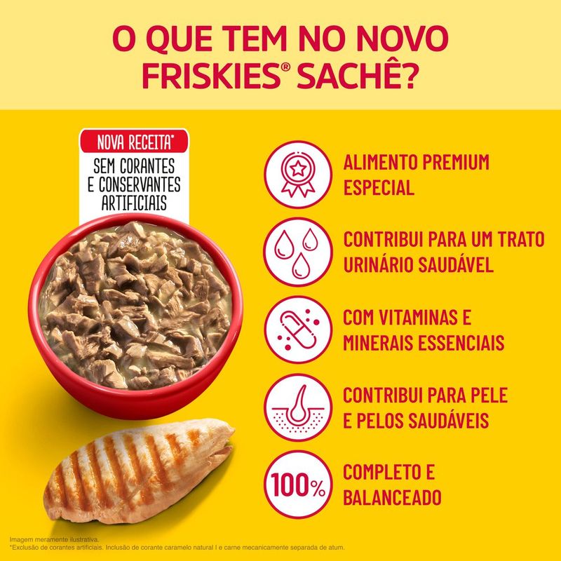 FRISKIES® Frango é um alimento úmido com sabor que os gatos adoram. É um alimento saboroso feito de pedaços com carne em um molho, sem corantes e conservantes artificiais. É um alimento premium especial, 100% completo e balanceado para gatos. Contribui para um trato urinário saudável e auxilia na hidratação diária. Ajuda a manter o seu gato saudável através da combinação de vitaminas e minerais essenciais. Contribui para pele e pelos saudáveis. Proteínas de alta qualidade que contribuem para manter músculos fortes. Para mais informações, acesse https://www.nestle.com.br/marcas/purina-friskies ou ligue para 0800-7701180.