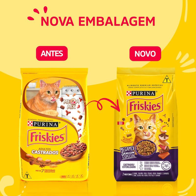PURINA FRISKIES oferece uma aventura nutritiva e deliciosa a cada mordida para seu gato. É uma ração premium especial e agora sem corantes artificiais. Friskies é um alimento nutricionalmente completo e balanceado e possui tudo que seu gato precisa para se manter saudável. Contém formatos que brincam com sua imaginação para que ele tenha nutrição, sabor e diversão todos os dias.PURINA FRISKIES Megamix para gatos castrados tem uma deliciosa combinação de carne, salmão, peru, fígado, atum, frango e camarão e sua composição ajuda na manutenção do peso saudável. Possui também proteínas de alta qualidade, que ajudam a manter os músculos fortes. Contribui para manter o trato urinário saudável, em razão do equilíbrio adequado de minerais, além de oferecer vitaminas e minerais essenciais que os mantêm saudáveis.