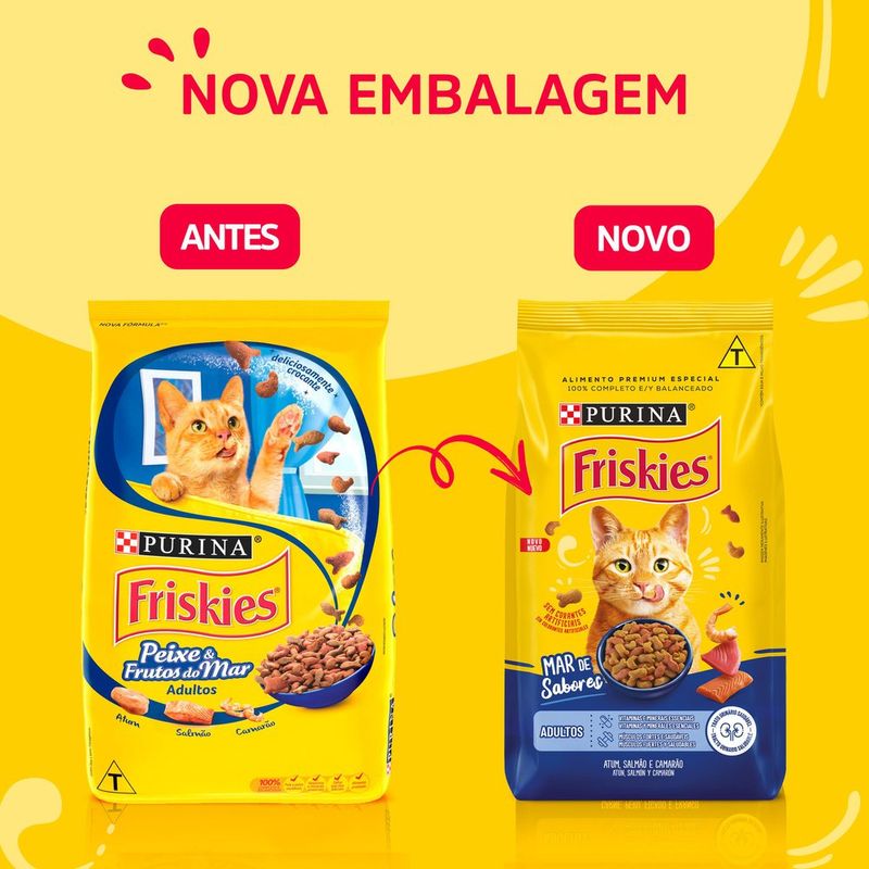 PURINA FRISKIES oferece uma aventura nutritiva e deliciosa a cada mordida para seu gato. É uma ração premium especial e agora sem corantes artificiais. Friskies é um alimento nutricionalmente completo e balanceado e possui tudo que seu gato precisa para se manter saudável. Contém formatos que brincam com sua imaginação para que ele tenha nutrição, sabor e diversão todos os dias.PURINA FRISKIES Mar de Sabores para gatos adultos tem uma deliciosa combinação de atum, salmão e camarão.  Sua composição contribui para manter o trato urinário saudável, em razão do equilíbrio adequado de minerais. Possui também proteínas de alta qualidade, que ajudam a manter os músculos fortes e oferece vitaminas e minerais essenciais, que os mantêm saudáveis.