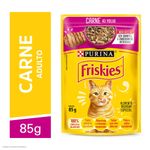 FRISKIES® Carne é um alimento úmido com sabor que os gatos adoram. É um alimento saboroso feito de pedaços com carne em um molho, sem corantes e conservantes artificiais. É um alimento premium especial, 100% completo e balanceado para gatos. Contribui para um trato urinário saudável e auxilia na hidratação diária. Ajuda a manter o seu gato saudável através da combinação de vitaminas e minerais essenciais. Contribui para pele e pelos saudáveis. Proteínas de alta qualidade que contribuem para manter músculos fortes. Para mais informações, acesse https://www.nestle.com.br/marcas/purina-friskies ou ligue para 0800-7701180.