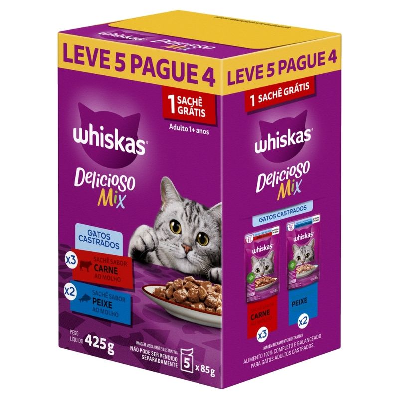 Alimento Gato Whiskas Mix Carne e Peixe 85g Sachê Leve 5 Pague 4