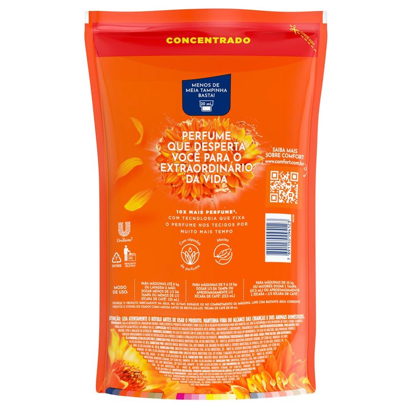 • O Amaciante Concentrado Comfort Energia Floral proporciona 10x mais perfume**, contém óleo de argan***** e cápsulas de perfume que garantem uma fragrância intensa e duradoura para suas roupas • O Amaciante Concentrado Comfort Energia Floral tem ótimo rendimento, menos de meia tampinha basta na sua lavagem*! Rende 4 Litros e 45 lavagens* • O Amaciante Concentrado Comfort Energia Floral possui óleo de argan*****, que cuida intensamente das suas roupas enquanto as perfuma por muito tempo • Esse amaciante de roupa possui cápsulas de perfume para roupas que blindam contra o mau odor**** e perfumam sua lavanderia • Comfort previne suas peças dos danos da lavagem de roupa, mantendo as cores*** dos tecidos vibrantes e evitando a formação de bolinhas*** e esgarçamento*** • Comfort pensa nas suas roupas e no meio ambiente! Além de ser concentrado, sua garrafa e tampa são feitas de plástico 100% reciclado e reciclável. O Amaciante Concentrado Comfort Energia Floral tem 10x mais perfume** de longa duração, por isso deixa suas roupas perfumadas por muito mais tempo. Sua formulação incrível possui cápsulas de perfume que são liberadas durante a lavagem, para deixar uma fragrância duradoura nas suas roupas e blindar o tecido contra o mau odor****. O amaciante de roupa Comfort concentrado possui perfume encapsulado que penetra no tecido durante o processo de lavagem, deixando sua roupa muito mais cheirosa até mesmo depois de seca! O motivo? Quando você se movimenta, essas cápsulas de perfume para roupas se rompem e liberam essa fragrância incrível, fazendo com que aquele cheirinho de roupa lavada dure muito mais! Além disso, sua fórmula contém óleo de argan*****, um óleo natural com alto potencial nutritivo, que perfuma e trata suas roupas, prevenindo os danos da lavagem, mantendo as cores*** do tecido vibrantes por mais tempo, evitando a formação de bolinhas*** e esgarçamento***. Comfort te oferece tudo isso com um ótimo rendimento. Por ser concentrado, menos de meia tampinha ba