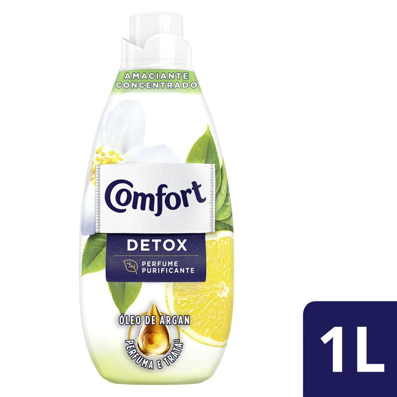 • O Amaciante Concentrado Comfort tem óleo de argan em sua fórmula! • Amaciante com fragrância natural de chá verde. • Amaciante dermatologicamente testado. • Perfume purificante. • Comfort tem ótimo rendimento, menos de meia tampinha basta! • Comfort evita formação de bolinhas e o desbotamento das cores. O Amaciante Concentrado Comfort Detox tem perfume purificante e faz sua roupa durar muito mais! Sua nova fórmula contém óleo de argan (um óleo natural com alto potencial nutritivo) que previne os danos da lavagem, mantendo as cores do tecido vibrantes por mais tempo e suas roupas muito perfumadas. Menos de meia tampinha de Comfort concentrado basta para lavar suas roupas. Sua fórmula foi desenvolvida com menos químicos, não possui corantes, além de sua fórmula ser dermatologicamente testada. O Amaciante Concentrado Comfort Detox traz delicadeza com uma fragrância natural 100% biodegradável que faz bem para sua roupa e para o meio ambiente. Sua formulação fresca, com notas naturais de lavanda e chá verde, revitaliza a fibra das roupas, envolvendo-as em uma experiência única de cuidado para que elas durem muito mais! O cuidado intensivo de Comfort funciona da mesma forma que um condicionador para cabelos: alinha os fios, mantém sua forma original e ajuda a controlar a quebra das fibras, reduzindo futuros danos nas peças. Com o amaciante Comfort suas roupas ficam livres de bolinhas, conservam a sua forma e cor, como se ela tivesse acabado de sair da loja. Com o amaciante concentrado Comfort sua roupa favorita dura muito mais!
