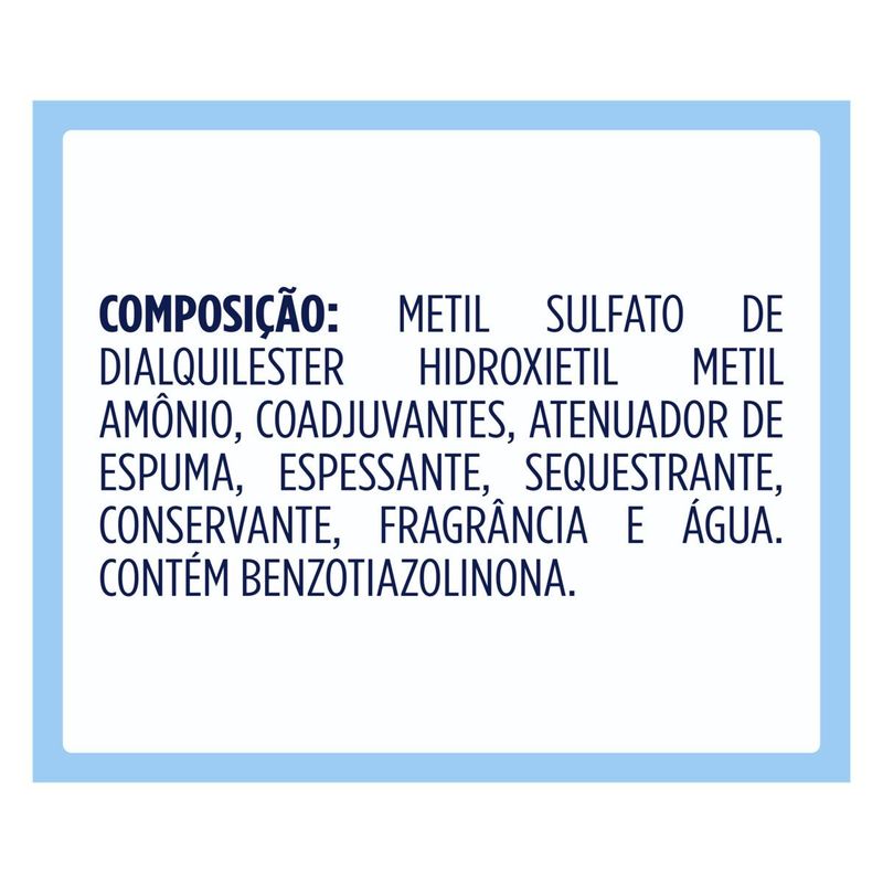 • O Amaciante Concentrado Comfort Puro Cuidado foi especialmente desenvolvido para peles sensíveis e delicadas, sendo dermatologicamente testado • A nova fórmula contém óleo de argan que previne os danos da lavagem, mantendo as cores dos tecidos vibrantes e evita a formação de bolinhas e esgarçamento**. Garante maciez e suavidade aos tecidos • Com um toque de aveia* que traz carinho e delicadeza até para as peles mais sensíveis, seguro para usar nas roupas de bebê • O Amaciante Concentrado Comfort Puro Cuidado tem um perfume suave e é hipoalergênico, recomendado para peles delicadas*** • A embalagem deste amaciante é feita com 50% de plástico reciclado, diminuindo assim o impacto ambiental • O Amaciante Concentrado Comfort possui uma embalagem econômica LEVE MAIS E PAGUE MENOS que rende mais de 4 L, o equivalente a 50 lavagens****. Menos de meia tampinha basta para lavar suas roupas! O Amaciante Concentrado Comfort Puro Cuidado tem perfume suave com extrato de aveia, recomendado para peles delicadas*** e faz as roupas durarem muito mais! Sua nova fórmula contém óleo de argan, um óleo natural com alto potencial nutritivo, que previne os danos da lavagem, mantendo as cores do tecido vibrantes por mais tempo, evitando a formação de bolinhas e esgarçamento**. Este amaciante de roupas contém extrato de aveia* que penetra profundamente nas fibras do tecido durante a lavagem, deixando-as com uma maciez irresistível, toque gentil e com todo cuidado que as peles sensíveis merecem. É livre de corantes e das microcápsulas de perfume, componentes com alto potencial de irritabilidade para as peles mais delicadas. Os ingredientes de Comfort Concentrado conseguem alinhar e proteger o tecido, reduzindo o atrito entre as fibras de suas roupas durante o processo de lavagem. Sua fórmula além de ser hipoalergênica é dermatologicamente testada por pediatras, dermatologistas e outros profissionais da saúde. Dessa forma, O Amaciante Concentrado Comfort Puro Cuidado é indicado para