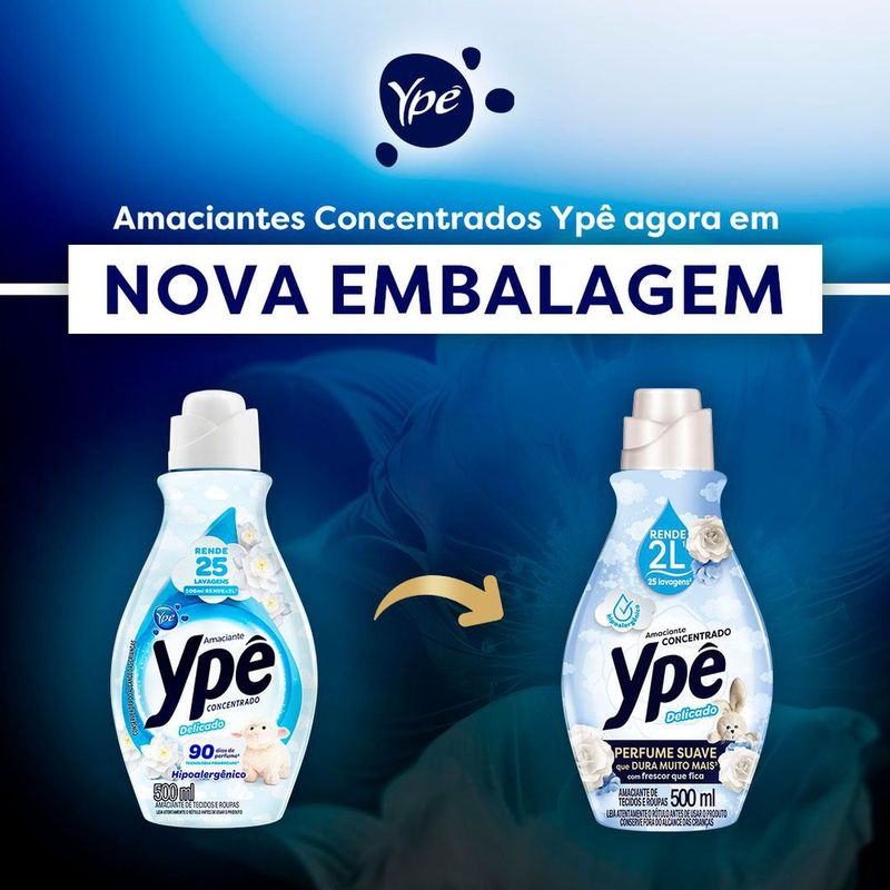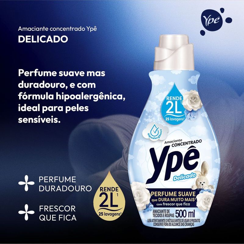 O Amaciante Concentrado Ypê Delicado foi carinhosamente elaborado para, além de oferecer uma fragrância exclusiva, proporcionar maciez às roupas e proteger as peles sensíveis. Hipoalergênico e dermatologicamente testado, tem em sua fórmula a tecnologia de Cápsulas de Perfume que aderem às fibras no momento da lavagem, permanecendo nas roupas mesmo após dias na gaveta. Seu suave e agradável perfume é liberado com o movimento dos tecidos.