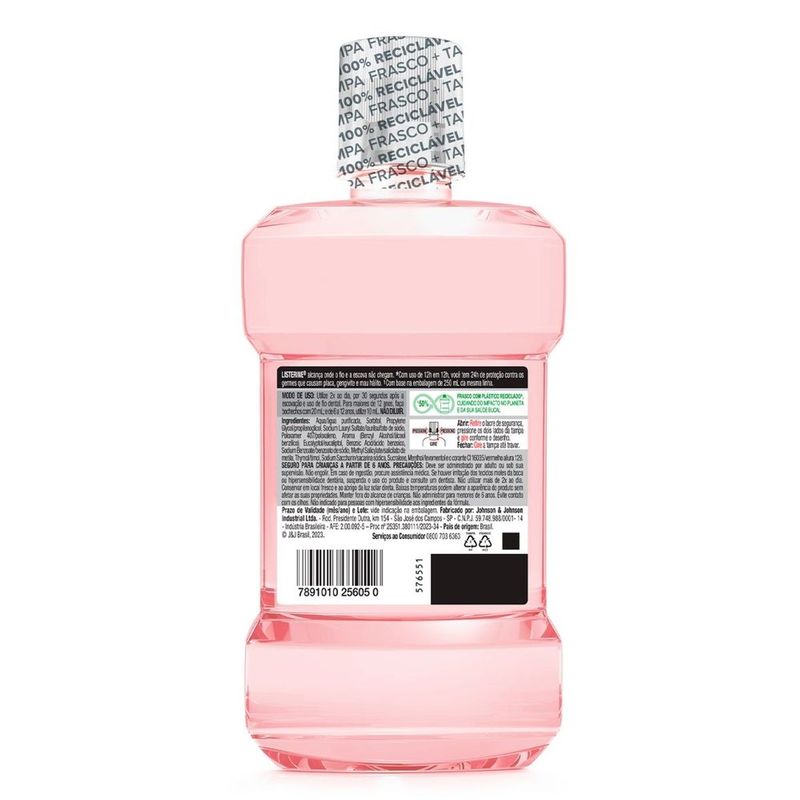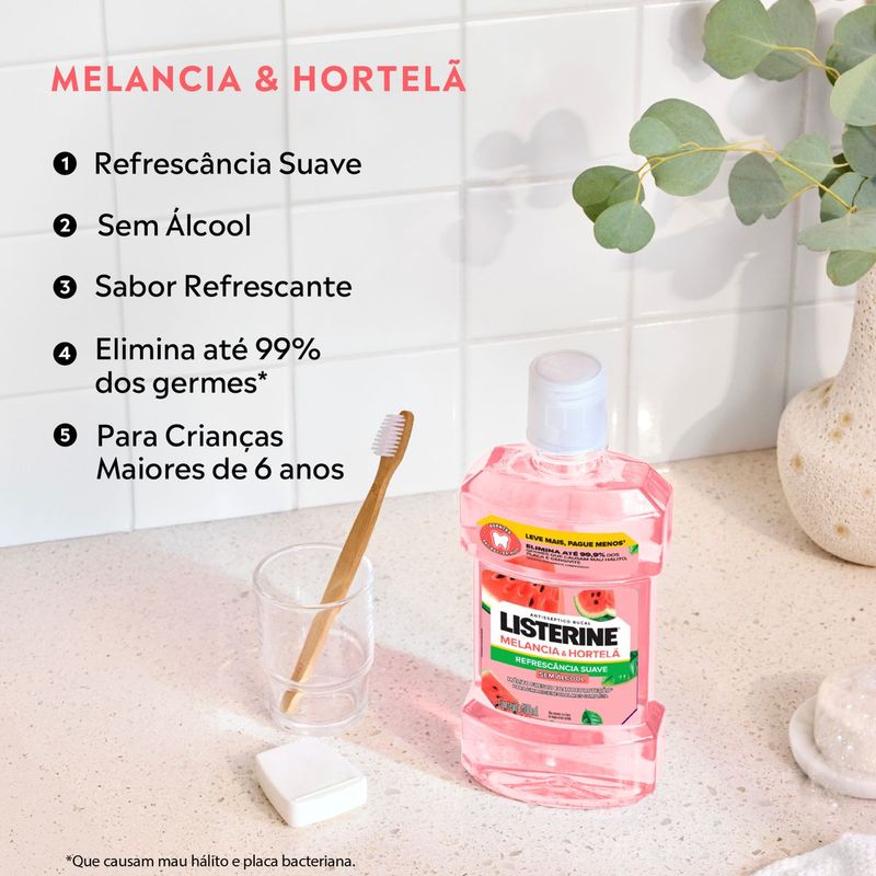 Você sabia que os dentes são apenas 25% da sua boca? Por isso, apenas a escovação não garante uma limpeza completa. Adicione LISTERINE® Melancia & Hortelã Enxaguante Bucal Sem Álcool, 500mL à sua rotina e limpe aonde a escova não alcança, eliminando até 99% dos germes* causadores de mau hálito, placa bacteriana e gengivite. Inclua LISTERINE® e limpe até 100% da sua boca. Benefícios e diferenciais - Refrescância Suave de Melancia & Hortelã - Sem álcool -Mais proteção contra mau-hálito, placa e gengivite*. *vs. somente escovação -Fórmula exclusiva com agentes antibacterianos -O enxaguante n°1 do mundo -Mata até 99,9% dos germes que causam os principais problemas bucais -Produto 100% reciclável (frasco e tampa) e feito com 50% de plástico reciclado -24 horas de proteção com o uso a cada 12 horas -Especialista em enxaguante bucal há mais de 140 anos