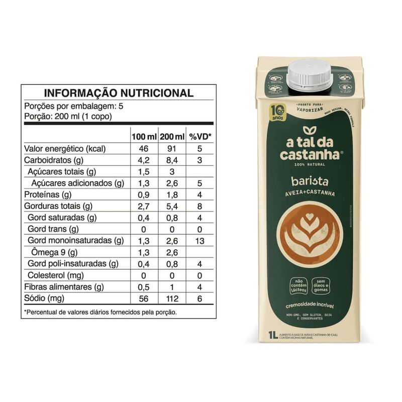 O leite vegetal A Tal da Castanha Barista, sabor caju e aveia, é uma bebida saborosa, nutritiva e 100% vegetal. Desenvolvida para tornar seu café perfeito, pode acompanhar bebidas quentes e frias. É a alternativa perfeita ao leite, sem aditivos artificiais ou conservantes, livre de glúten, soja e lácteos. Ideal para veganos, vegetarianos e pessoas com dietas restritivas. Nesta versão, seu leite vegetal A Tal da Castanha vem em embalagem de 1 litro.
