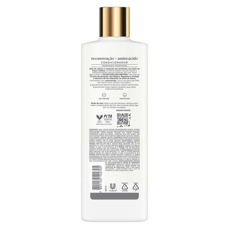 • Dove Condicionador Reconstrução + Aminoácido é ideal para cabelos danificados, oferecendo uma reconstrução capilar intensa e reparando até 99% dos danos internos do fio com apenas 5 usos, graças à tecnologia Bio-Protein • Conta com ativos reparadores que fortalecem os fios, restaurando profundamente e protegendo a estrutura do cabelo contra danos futuros, perfeito para incluir no cronograma capilar • Este condicionador com aminoácidos para cabelo danificado age tanto na superfície quanto na estrutura interna dos fios, proporcionando reparação profunda, devolvendo a maciez e brilho desde o primeiro uso • Sua fórmula é dermatologicamente testada, e cruelty-free, garantindo um cuidado seguro e consciente para cabelos ressecados e fragilizados • Com embalagem de 370 ml, o Condicionador Dove para cabelos ressecados oferece o melhor equilíbrio entre nutrição, reconstrução e proteção, mantendo seus cabelos saudáveis e revitalizados diariamente Cerca de 90% da estrutura capilar é composta por proteínas, essenciais para a força, resistência e beleza dos fios. Quando danificados, os cabelos perdem essas proteínas vitais, por isso, Dove desenvolveu uma fórmula com aminoácidos e a exclusiva Tecnologia Bio-Protein, capaz de reparar até 99% dos danos internos* e restaurar a vitalidade do cabelo desde o primeiro uso. Dove Condicionador Reconstrução + Aminoácido, expert em danos, foi desenvolvido especialmente para cabelos danificados. Sua fórmula avançada repara profundamente, fortalece e protege a estrutura dos fios, promovendo força, resistência e devolvendo a beleza dos fios em poucos usos. Enriquecido com aminoácidos, este condicionador trata as áreas mais comprometidas do cabelo, prevenindo até 90% da quebra dos fios e danos futuros causados por calor, química e escovação. É ideal para compor a etapa de reconstrução do seu cronograma capilar. Seguro e eficaz, o Dove Condicionador Reconstrução + Aminoácido é dermatologicamente testado, cruelty-free. Para alcançar os