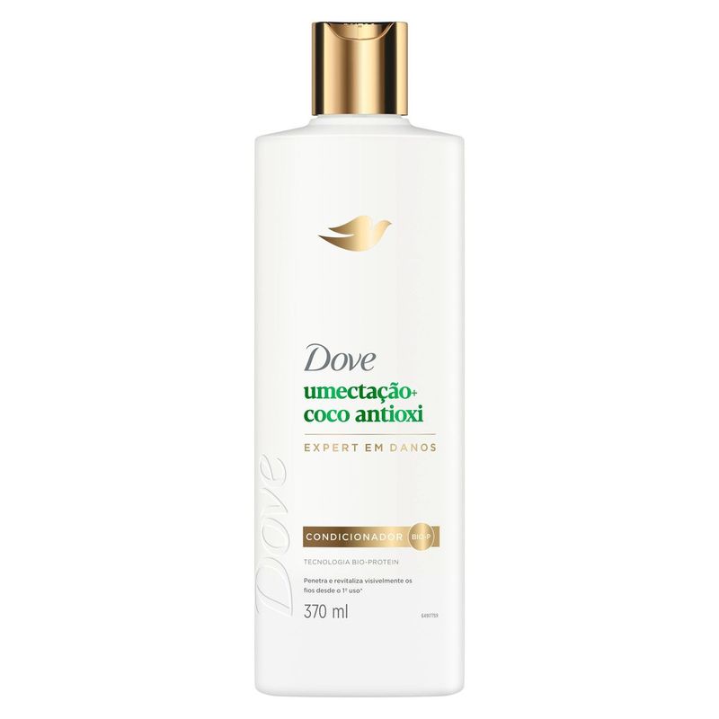 • Dove Condicionador Umectação + Coco Antioxi nutre profundamente com óleo de coco, restaurando brilho e maciez aos fios secos e opacos • Condicionador com ativo nutritivo do coco para nutrição capilar que repõe lipídios essenciais e sela as cutículas em apenas 1 minuto* • Com a tecnologia patenteada Umectação + Coco Antioxi e BIO-PROTEIN, repara, regenera e protege a cutícula contra os principais sinais de danos • Dove Condicionador Umectação + Coco Antioxi garante brilho intenso, fios leves, alinhados e até 10× mais resistentes à quebra* • Condicionador com ação antioxidante e umectante que age como creme condicionante para fios ressecados, reduz o frizz e protege contra danos futuros O Dove Condicionador Umectação + Coco Antioxi é especializado em cabelos ressecados, combinando óleo de coco e antioxidantes para nutrição profunda. Sua tecnologia patenteada BIO-PROTEIN, desenvolvida em mais de uma década de pesquisa, repara e protege a cutícula capilar, reduzindo visivelmente os sinais de danos desde a primeira aplicação*. Expert em danos, este condicionador umectante penetra nos fios com coco e agentes antioxidantes, revitalizando cabelos opacos e quebradiços. Ideal para uso regular após o shampoo da mesma linha, proporciona hidratação duradoura e brilho intenso, mesmo em fios severamente ressecados*. Indicado para todos os tipos de cabelos, principalmente os secos, opacos e danificados, o condicionador Dove pode ser usado diariamente como parte de um cronograma capilar completo. Para melhores resultados, utilize a linha completa Dove Umectação + Coco Antioxi. *Com o uso do shampoo e condicionador da linha em comparação com shampoo sem agentes condicionantes.