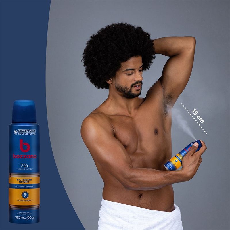 Desenvolvido para garantir proteção máxima em momentos extremos, a fórmula sem álcool do desodorante aerossol Bozzano Extreme Sport foi aprovada por atletas. Com tecnologia Thermo Control, o desodorante controla o suor e o mau odor por 72 horas, independente da temperatura.