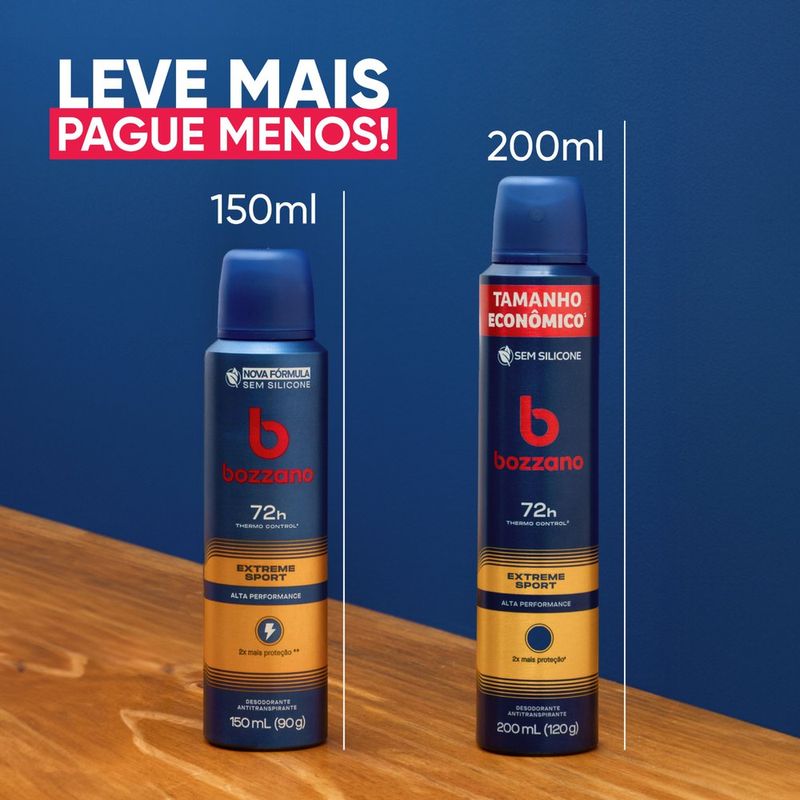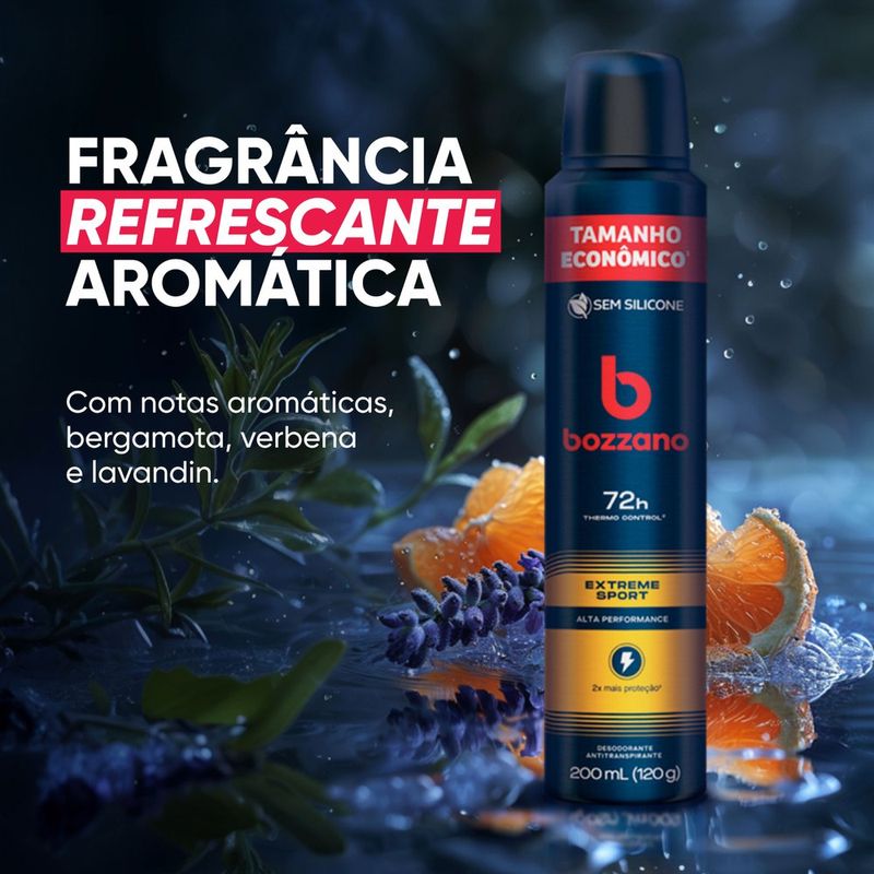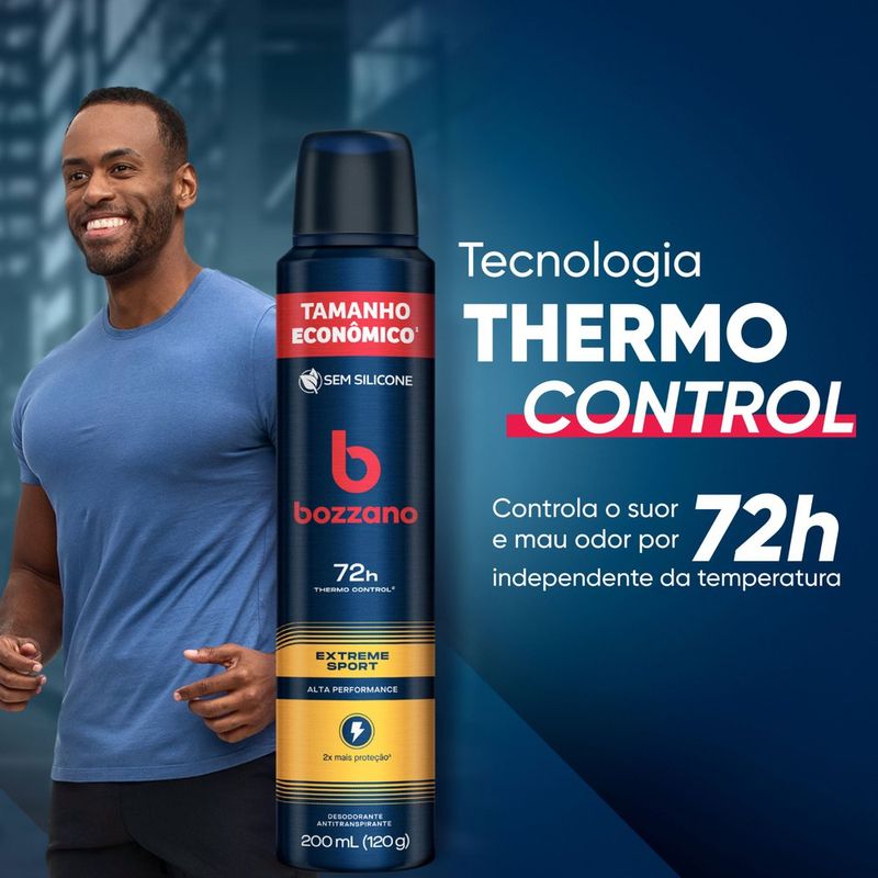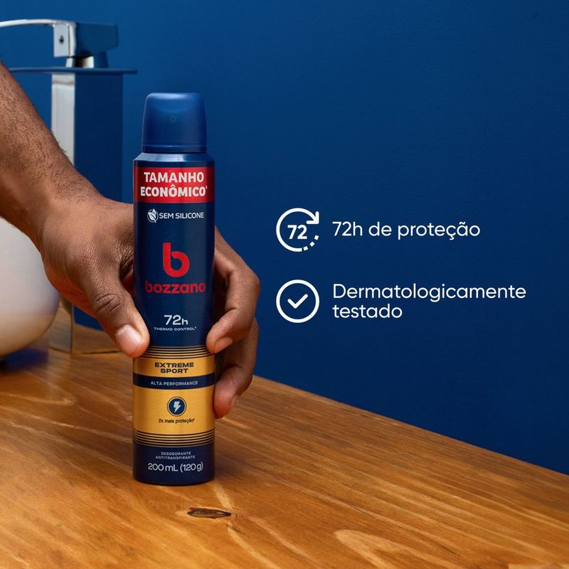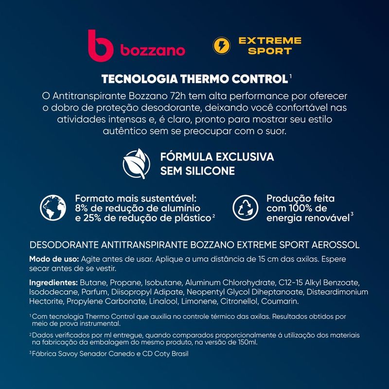 O Desodorante Bozzano Extreme Sport conta com 2x mais proteção e a tecnologia Thermo Control, que garante até 72 horas de proteção antitranspirante, independente da temperatura. Proporciona um cuidado extra na axila, além de possuir uma fragrância aromática e refrescante. Agora em nova embalagem econômica de 200ml, que oferece mais praticidade e rendimento no uso diário, com fórmula exclusiva sem silicone. Conheça a linha completa de desodorantes Bozzano! Só uma marca 100% brasileira e masculina poderia oferecer uma linha completa de produtos que atendem todas as necessidades do homem!