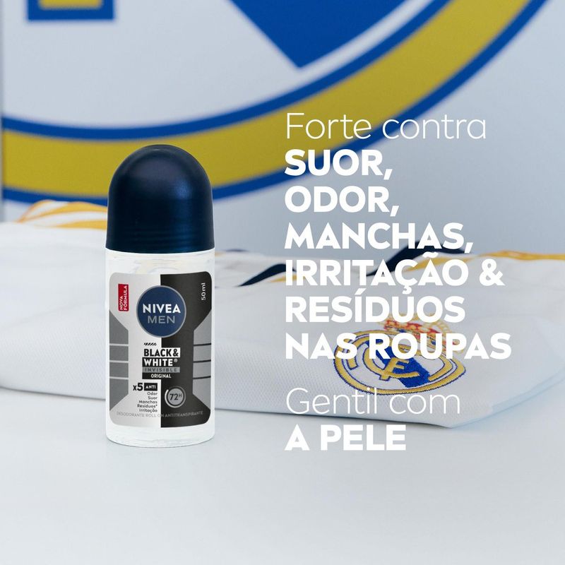 O que é? Desodorante roll on que refresca, protege por 48h e evita manchas nas roupas. Você livre de manchas, suor e mau odor. Confira! Para que serve o Desodorante Roll On Nivea Men Invisible Black & White? Poderosa fórmula elimina 99,9% das bactérias e evita manchas brancas em roupas pretas e manchas amarelas em roupas brancas. Benefícios e diferenciais - A melhor proteção contra manchas e suor - 2x mais agentes antitranspirantes e minerais - Sem álcool etílico e corantes Como usar o Desodorante Roll On Nivea Men Invisible Black & White? Agite bem antes de usar. Ao aplicar o produto, mantenha o frasco a aprox. 15 cm da axila. Espere secar antes de se vestir. Uma unidade de embalagem contém 50ml