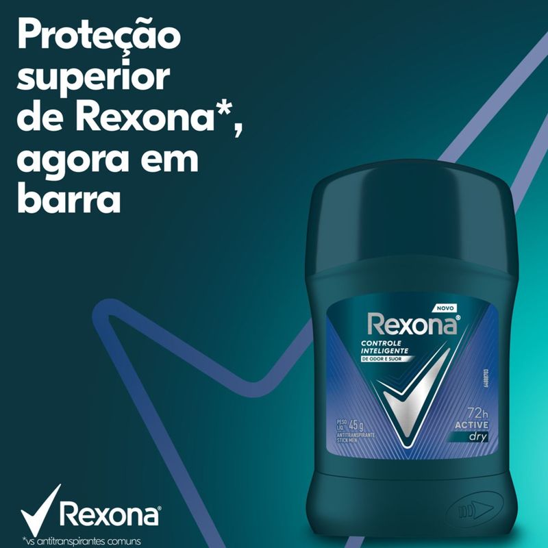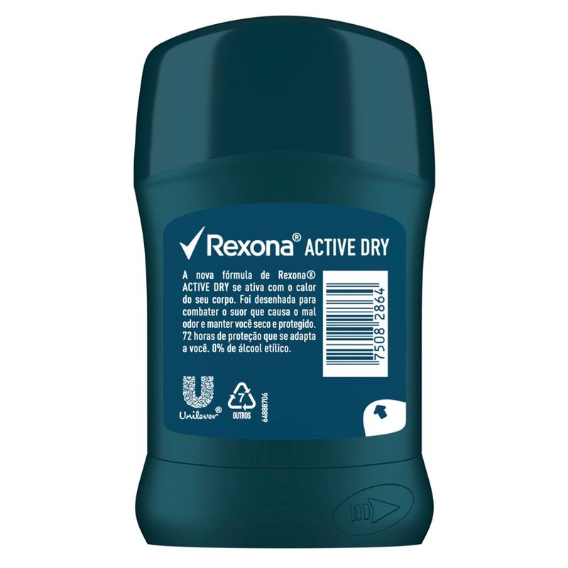 • Antitranspirante Masculino Rexona Active Dry, proteção superior que não te abandona, agora em barra • Desodorante masculino com controle inteligente de odor e suor • 72h de proteção antitranspirante ativada pelo movimento, mantendo você seco e fresco quando mais precisar • Novo desodorante antitranspirante com 0% de álcool etílico • O novo formato em barra do Antitranspirante Rexona Active Dry garante uma aplicação seca • O Antitranspirante Masculino em Barra Rexona Active Dry possui fragrância cítrica e refrescante, garantindo a sensação de frescor durante o dia inteiro Conheça o novo desodorante antitranspirante em barra de Rexona, a proteção superior que não te abandona*, agora em um novo formato. Continue se movimentando e não deixe que o suor e o mau cheiro te atrapalhem, com o Rexona Active Dry antitranspirante em barra, você pode ter certeza de que a proteção de Rexona não vai te decepcionar, mesmo nos momentos mais difíceis. Desenvolvido com tecnologia exclusiva de controle inteligente de odor e suor, sua fórmula contém um ativo antitranspirante patenteado pela Unilever, altamente eficaz. Este componente foi projetado para se adaptar às condições das axilas, proporcionando um controle eficiente do suor e do odor por até 72 horas. Além disso, é ativado pelo movimento, mantendo-o seco e fresco quando você mais precisa. Sua fórmula em barra é sem álcool etílico e garante uma aplicação seca. Maximize o poder do Rexona Active Dry antitranspirante em barra aplicando-o uniformemente na pele seca das axilas, certificando-se de cobri-la completamente. Sua fragrância contém uma combinação de notas cítricas e verdes, garantindo sensação refrescante durante o dia inteiro. Com Rexona, queremos inspirar confiança em todos para se movimentarem mais e irem mais longe. Sinta-se confiante com a proteção diária de Rexona. Rexona não te abandona. *vs antitranspirantes comuns
