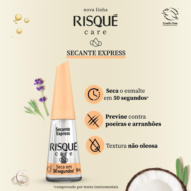 O Secante Express da linha Risqué Care ajuda o esmalte a secar mais rápido. Em 50 segundos, previne contra poeiras, arranhões e borrões superficiais. Sensorial líquido com textura não oleosa. Risqué Care é uma linha de cuidados completa do início ao fim. Conta com 7 produtos em sua linha, todos eles com óleos naturais. Um cronograma de cuidados antes, durante e depois da esmaltação.