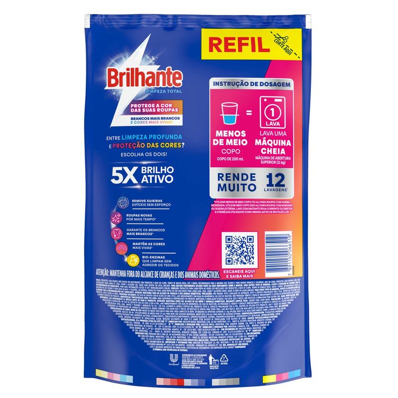 • O Lava Roupas Líquido Brilhante Limpeza Total é composto por enzimas de limpeza profunda e ajuda a prevenir sinais de desgaste das roupas e nos tecidos • Sabão líquido com blindagem das cores que deixa suas roupas novas por mais tempo* • Este lava roupas possui tecnologia Brilho Ativo, que mantém os brancos impecáveis e cuida das cores • O Sabão Líquido Brilhante Limpeza Total limpa suas roupas profundamente e sem desbotar o tecido desde a primeira lavagem • Refil, 900 ml rende 9 lavagens. Com meio copo americano lava uma máquina cheia • Com Brilhante Limpeza Total suas roupas terão as cores muito mais vivas e mais impactantes após cada lavagem O Lava Roupas Líquido Brilhante Limpeza Total combina os melhores resultados de limpeza com a proteção das cores dos tecidos. A nova fórmula deste sabão líquido contém o poder das enzimas, proporcionando uma limpeza profunda e evitando que a sujeira se deposite nas roupas. Além disso, o Sabão Líquido Brilhante Limpeza Total possui a tecnologia Brilho Ativo que evita o amarelamento das roupas brancas e mantém os coloridos do tecido muito mais vivos, prevenindo os sinais de desgaste das suas peças preferidas, deixando suas roupas novas por mais tempo*. Entre limpeza profunda e blindagem da cor? Escolha os dois! Com Brilhante, você sempre leva mais. Refil, 900 ml rende 9 lavagens, com apenas meio copo americano para lavar uma máquina cheia. Brilhante quer se tornar um aliado nas tarefas diárias de seus consumidores e busca proporcionar maior praticidade com produtos inovadores e fáceis de usar, diminuindo o peso das tarefas e liberando tempo para as demais atividades do dia a dia. Acesse o site da marca e saiba mais! Dicas: produtos lava roupas não devem ser misturados com produtos à base de cloro. Tempo de molho ideal: Até 2 horas. Recomendado para a maioria dos tecidos e para roupas brancas e coloridas, mas em geral produtos lava roupas não são adequados para lavar lã, seda, couro e algodão cru. Seque suas roupas em lo