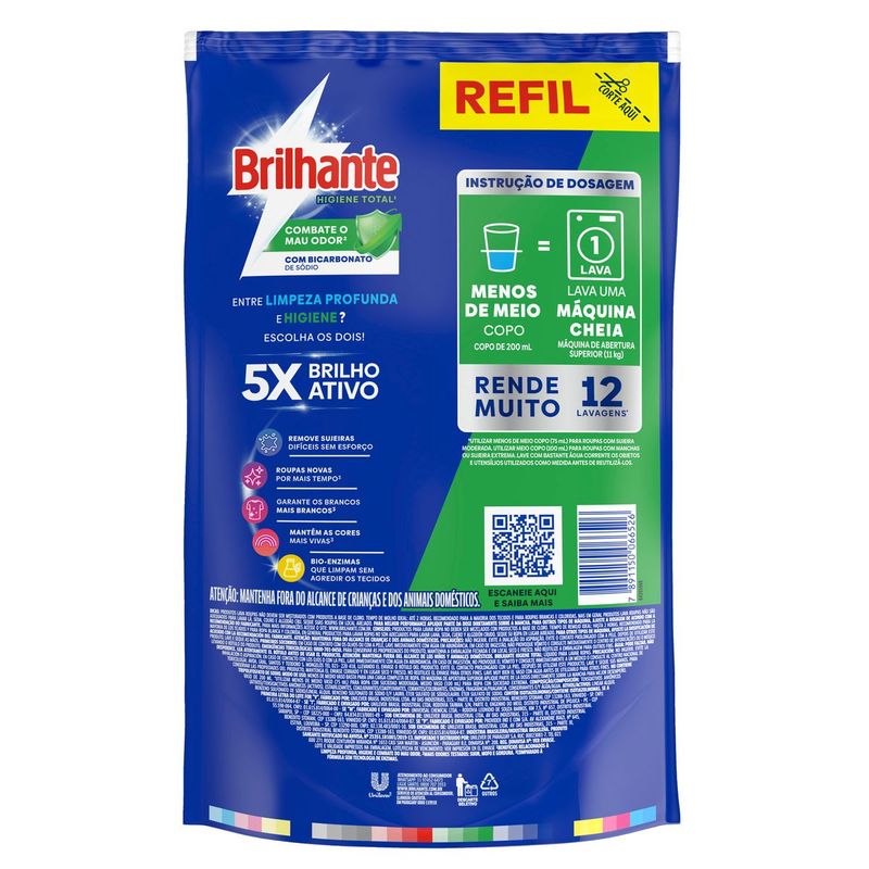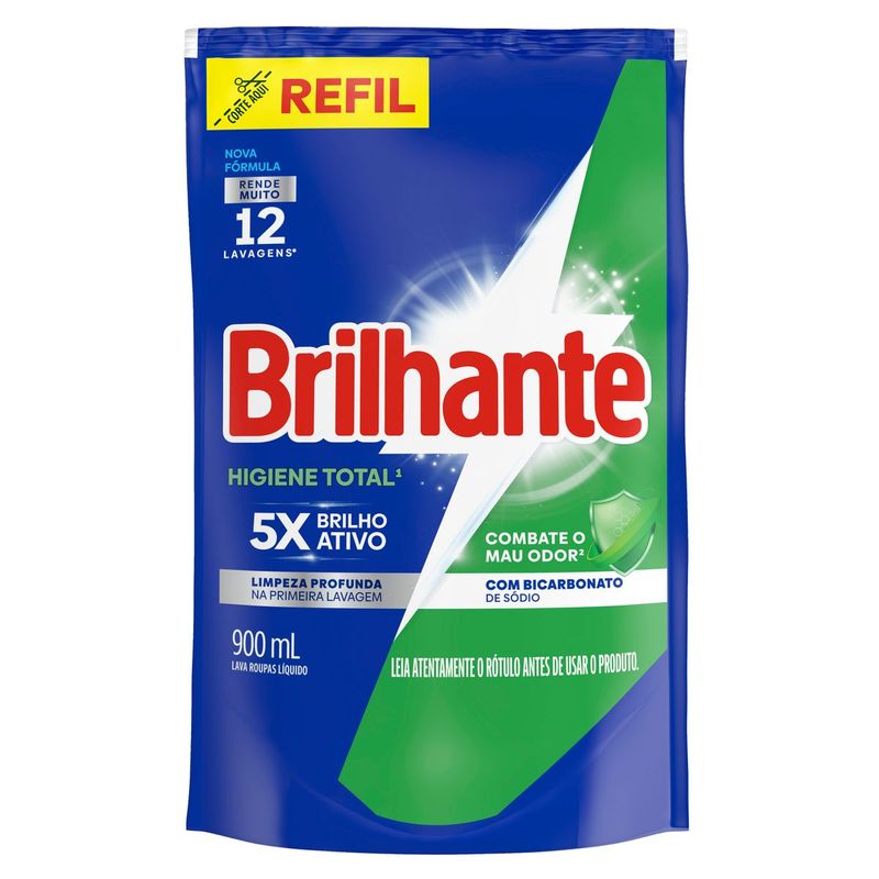 • O Lava Roupas Líquido Brilhante Higiene Total é composto por enzimas, evitando que a sujeira se deposite nas roupas e no tecidos • Sabão líquido que higieniza e combate o mau odor* do tecido • Este lava roupas possui bicarbonato de sódio em sua fórmula • O Lava Roupas Líquido Brilhante Higiene Total limpa suas roupas profundamente desde a primeira lavagem • Com o sabão líquido Brilhante, você sempre tem os melhores resultados de limpeza • Refil, 900 ml rende 9 lavagens. Com meio copo americano lava uma máquina cheia A nova fórmula do Lava Roupas Líquido Brilhante Higiene Total combina os melhores resultados de limpeza com a ação de combate ao mau odor* do tecido. Esse sabão líquido contém o poder das enzimas e do bicarbonato de sódio, proporcionando uma limpeza profunda desde a primeira lavagem, evitando que a sujeira se deposite nas roupas e no tecidos. Entre limpeza profunda e combate ao mau odor? Escolha os dois! Com o sabão líquido Brilhante, você leva sempre mais. Refil, 900 ml rende 9 lavagens, com apenas meio copo americano para lavar uma máquina cheia. Brilhante quer se tornar um aliado nas tarefas diárias de seus consumidores e busca trazer praticidade por meio de produtos inovadores e que todo mundo possa usar, diminuindo o peso das tarefas e liberando tempo para as demais atividades do dia a dia. Acesse o site da marca e saiba mais! Dicas: produtos lava roupas não devem ser misturados com produtos à base de cloro. Tempo de molho ideal: até 2 horas. Recomendado para a maioria dos tecidos e para roupas brancas e coloridas, mas em geral produtos lava roupas não são adequados para lavar lã, seda, couro e algodão cru. Seque suas roupas em local arejado. Para outros tipos de máquina de lavar, ajuste a dosagem de acordo com a recomendação do fabricante. *Maus odores testados: suor, mofo e gordura.