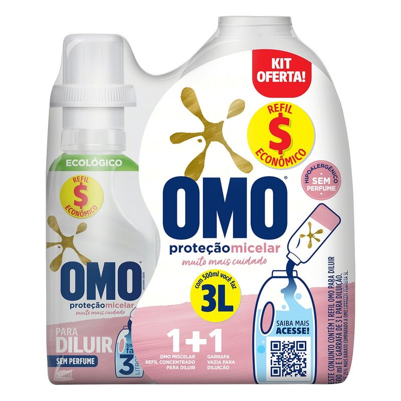 Imbatível na limpeza e cuida do meio ambiente. Limpa profundamente, sem danificar as roupas, cuidando de cada fio do tecido. Sem perfume e hipoalergênico. Cria uma camada protetora que blinda contra as sujeiras do dia a dia. Refil econômico, com 500 mL, você faz 3 litros. Mais sustentável: 72% menos plástico. O lava roupas OMO Proteção Micelar, além de limpar, é o melhor cuidado e proteção para as suas roupas, fazendo com que elas fiquem como novas por mais tempo. Sua fórmula possui tecnologia da proteção micelar, que remove toda a sujeira de maneira delicada, tratando fio a fio, e criando uma camada protetora que blinda sua roupa, impedindo que a sujeira do dia a dia impregne nos tecidos novamente. Além disso, realça as cores, remove as bolinhas, é hipoalergênico e é o único da linha que não possui perfume. Imbatível na limpeza¹, cuida do meio ambiente, pois sua fórmula contém ativo biodegradável, além de economizar água, uma vez que precisa de apenas 1 enxágue. Apenas uma tampa (100mL)² lava uma máquina cheia. Com o refil de 500 mL, você faz 3 L. O preparo é muito simples: pegue uma garrafa de 3 L vazia e limpa; coloque 2,5 L de água potável em temperatura ambiente; adicione 500 mL de OMO Proteção Micelar Refil para Diluir; e agite 3 vezes. Pronto! O produto está pronto para uso. O plástico da sua garrafa é feita de outras garrafas e é 100% reciclável. Faça o descarte consciente. Quando você escolhe OMO, você escolhe um mundo melhor. Juntos, sOMOs a transformação positiva para o meio ambiente. Seu uso é recomendado por Brastemp e Consul. ¹Comparado com detergentes líquidos do mesmo fabricante. Remove manchas como suco de laranja, sobremesa de chocolate e óleo de fritura, tecido algodão. Essa garrafa possui no mínimo 35% de PCR. ²A dosagem recomendada é para máquina de abertura superior, para outros tipos de máquina, ajuste a dosagem de acordo com a recomendação do fabricante.