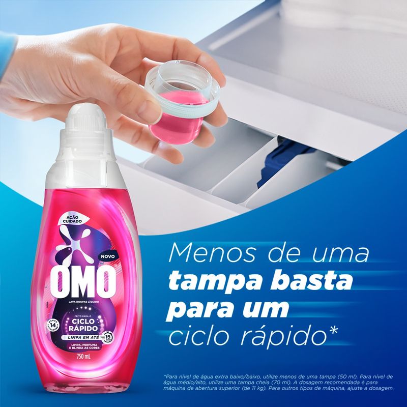 ? O Lava Roupas Líquido OMO Ação Cuidado garante limpeza impecável e perfumação intensiva das roupas mesmo em ciclos rápidos de até 15 minutos** ? Sua fórmula com poderosos agentes de limpeza, limpa, perfuma e blinda as cores de suas peças ? Este lava roupas líquido perfuma e limpa em profundidade sem agredir, não danifica os tecidos ? O detergente líquido OMO Ação Cuidado, garante roupas impecavelmente limpas, muito perfumadas e com cores vivas ? Além disso, esse lava roupas líquido é concentrado, menos de uma tampa basta para um ciclo rápido* ? A linha de Lava Roupas Líquido OMO Ciclo Rápido foi feita para limpar e perfumar no ciclo rápido Chegou o revolucionário Lava Roupas Líquido OMO Ação Cuidado para lavar suas roupas mesmo em ciclo rápido. Esse lava roupas líquido limpa de forma eficaz as sujeiras enquanto perfuma com sua fragrância intensa. Seu perfume proporciona a sensação de frescor de suas peças, e elimina as sujeiras em até 15 minutos** sem agredir e danificar os tecidos. A fórmula inovadora e poderosa do lava roupas líquido OMO Ação Cuidado, limpa, perfuma e blinda as cores. OMO lava roupas líquido é poderoso, 750 ml do produto rende 14 lavagens. Menos de uma tampa basta para um ciclo rápido*. Apesar deste lava roupas ter sido concebido para ciclo rápido, pode ser usado em qualquer tipo de ciclo, proporcionando poder de limpeza e fragrância duradoura. Experimente outros produtos da linha de Lava Roupas OMO feito para o ciclo rápido, como: Lava Roupas OMO Ação Antiodor e Lava Roupas OMO Ação Total, que limpam e perfumam no ciclo rápido. OMO, o rápido ficou ainda melhor. *Para nível de água extra baixo/baixo, utilize menos de uma tampa (50 ml). Para nível de água médio/alto, utilize uma tampa cheia (70 ml). A dosagem recomendada é para máquina de abertura superior (de 11 kg). Para outros tipos de máquina, ajuste a dosagem. **Sem considerar tempo de enchimento/drenagem de água e enxágue.