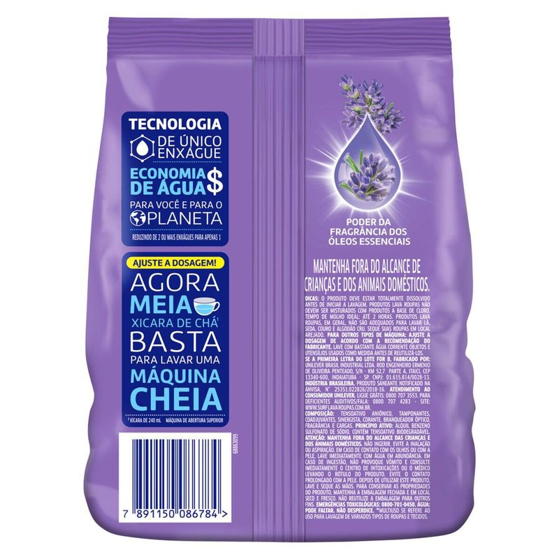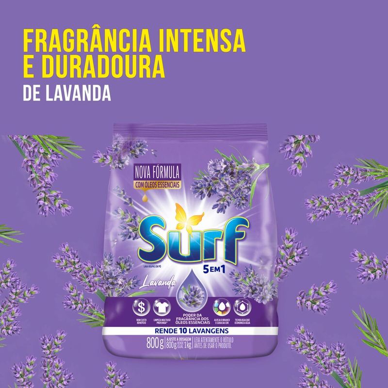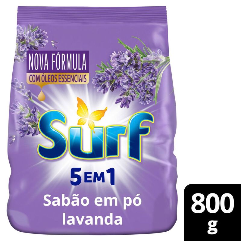 • O Sabão em pó 5 em 1 Surf Lavanda te dá o poder de limpeza através da fragrância dos óleos essenciais e do toque refrescante da lavanda • Ele fornece uma fragrância intensa e duradoura, mantendo suas roupas com uma sensação de refrescância por muito mais tempo • O Sabão em pó Surf 5 em 1 Lavanda consegue alvejar o branco e cuidar da cor das suas roupas ao mesmo tempo • Ajuste a dosagem! Agora meia xícara de chá* do sabão em pó basta para lavar uma máquina cheia • A marca Surf não está aqui apenas para lavar roupas, mas sim para ajudar você a se sentir confiante e confortável com você mesma • O Sabão em pó Surf 5 em 1 Lavanda está disponível nos tamanhos 800 g e no formato líquido de 3 L e 5 L em uma embalagem roxa divertida! O Sabão em pó Surf 5 em 1 Lavanda te dá muitos benefícios por menos! Em um único sabão em pó para lavar roupas você encontra poder de limpeza, fragrância intensa e duradoura, limpeza multiuso profunda** e bom custo-benefício, que alveja o branco, tira manchas e cuida da cor! Todos os benefícios a um preço acessível! Experimente a sensação de roupa recém-lavada e limpa com o Sabão em pó Surf 5 em 1 Lavanda. Sua fórmula oferece a solução completa e foi desenhada para entregar tudo o que você espera de um sabão em pó em um produto fácil e simples de usar. Isso tudo ainda te ajudando a economizar, pois possui tecnologia de único enxágue, reduzindo o processo de 3 ou três enxágues para apenas um, mantendo a performance de limpeza e sem deixar resíduos nas suas roupas. A marca Surf não está aqui apenas para lavar roupas, mas sim para ajudar você a se sentir confiante e confortável com você mesma. Ajuste a dosagem: Surf 5 em 1 agora vem com a nova tecnologia de único enxágue que economiza água, é concentrado e rende muito! Economia de água para você e para o planeta! Com apenas 1/2 xícara de chá* você lava uma máquina cheia! Os produtos lava-roupas da Surf vêm em três formatos diferentes para você escolher. São eles: o sabão em pó nos tamanhos de 800