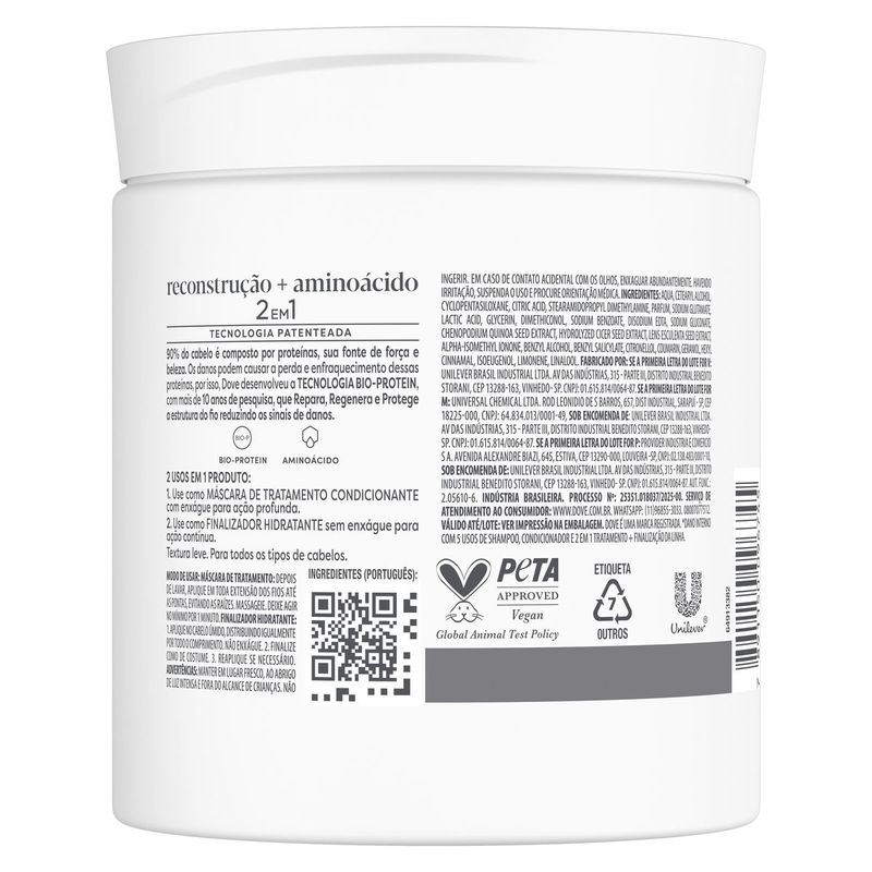 •Máscara Capilar Dove 2 em 1 Reconstrução + Aminoácido com tecnologia patenteada para reconstrução completa dos fios danificados •Tratamento com dois modos de uso: como máscara com enxágue ou finalizador sem enxágue para ação prolongada • Fórmula com aminoácidos e tecnologia Bio-Protein que repara até 99% dos danos internos e fortalece a fibra capilar • Máscara intensiva e hidratante ideal para cronograma capilar, com queratina vegana, dermatologicamente testada •Reduz pontas duplas, sela cutículas, previne o frizz e devolve brilho e maciez aos cabelos ressecados ou quimicamente tratados •Produto prático e versátil com resultados visíveis desde a primeira aplicação Dove Máscara Capilar 2 em 1 Reconstrução + Aminoácido é um tratamento capilar de alta versatilidade para cabelos danificados. Produto prático, ideal para o uso contínuo, além de contar com uma fórmula avançada proporciona resultados visíveis desde a primeira aplicação. Com dois modos de uso, atua como máscara de tratamento com enxágue para hidratação profunda e como finalizador hidratante sem enxágue para nutrição prolongada. Desenvolvida com tecnologia patenteada Bio-Protein e aminoácidos, repara até 99% dos danos internos*, fortalecendo a estrutura capilar e revitalizando os fios de dentro para fora. Essa máscara capilar intensiva reduz pontas duplas, previne o frizz, sela as cutículas e devolve o brilho e a maciez, sendo ideal para cabelos fragilizados, ressecados ou quimicamente tratados. É um creme hidratante essencial para complementar a etapa de reconstrução do cronograma capilar, oferecendo benefícios de salão no cuidado diário. Formulada com queratina vegana, dermatologicamente testada, essa máscara é um exemplo de cuidado seguro e consciente. Dove, expert em danos, entende que 90% da composição do cabelo é feita de proteínas que, ao serem perdidas, comprometem a força e a beleza dos fios, por isso desenvolveu uma solução completa para reparar, regenerar e proteger cada fio. P