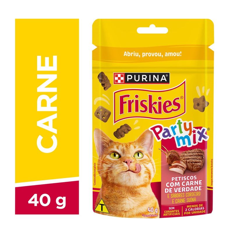 "PURINA FRISKIES® PARTY MIX® Compartilhe momentos amorosos e divertidos com este delicioso petisco feito com carne de verdade¹ que foi desenvolvido para fazer seu gato explorar diferentes formas, cores naturais e sabores. Além disso, contém proteínas e vitaminas para ajudar o seu gato a ter uma vida saudável e feliz.