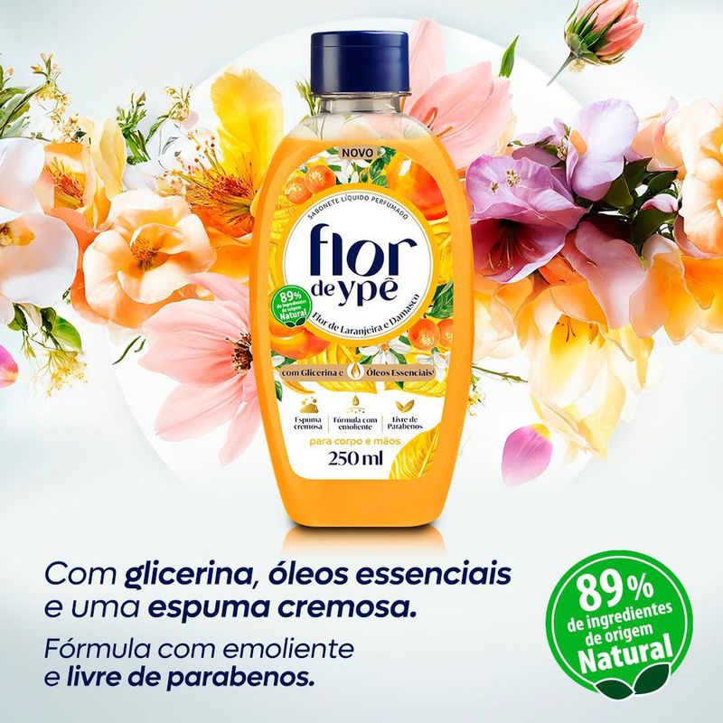 Sabonete Liquido Flor Ypê Laranja e Damasco 250ml, Disponível em 5 versões: Rosas Brancas e Avelã; Flor de Maçã e Framboesa; Flor de Laranjeira e Damasco; Frésia e Pêssego; Água de Coco e Alecrim Com óleos essenciais e glicerina; Espuma cremosa e fórmula com emolientes, que contribuem para a proteção da pele Para corpo e mãos Testado dermatologicamente Livre de parabenos