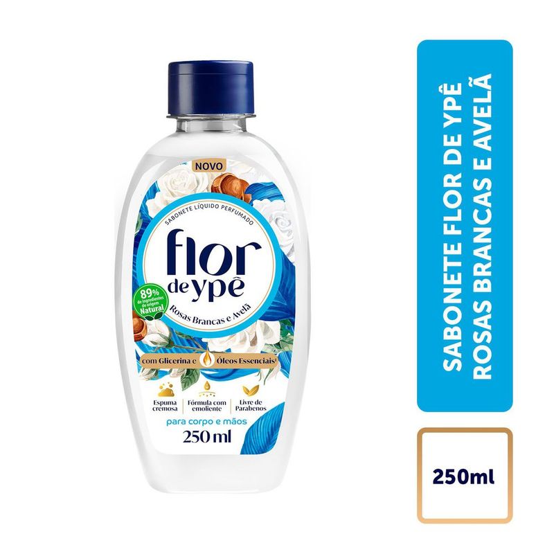 Sabonete liquido Flor Ypê Rosas Brancas e Avelã 250ml, Disponível em 5 versões: Rosas Brancas e Avelã; Flor de Maçã e Framboesa; Flor de Laranjeira e Damasco; Frésia e Pêssego; Água de Coco e Alecrim Com óleos essenciais e glicerina; Espuma cremosa e fórmula com emolientes, que contribuem para a proteção da pele Para corpo e mãos Testado dermatologicamente Livre de parabenos