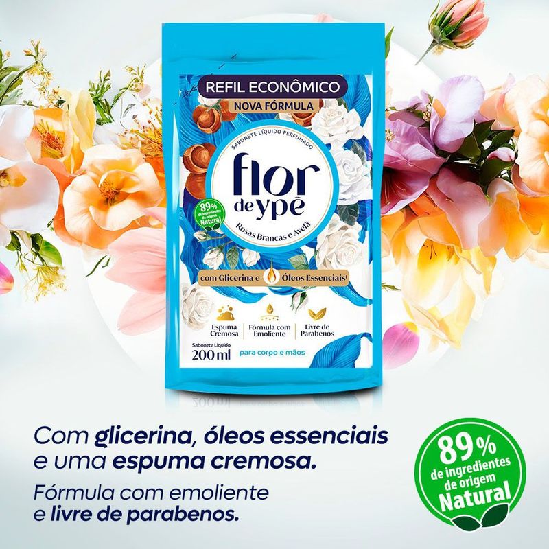 Sabonete Liquido Flor Ypê Rosas Brancas e Avelã Refil 200ml, Disponível em 5 versões: Rosas Brancas e Avelã; Flor de Maçã e Framboesa; Flor de Laranjeira e Damasco; Frésia e Pêssego; Água de Coco e Alecrim Com óleos essenciais e glicerina; Espuma cremosa e fórmula com emolientes, que contribuem para a proteção da pele Para corpo e mãos Testado dermatologicamente Livre de parabenos