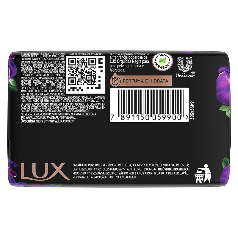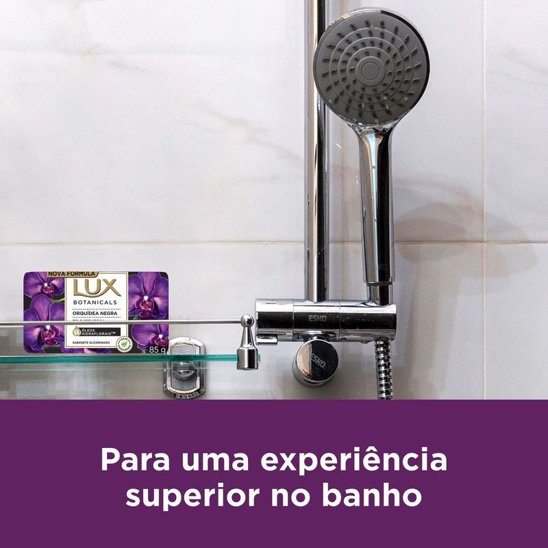 • O Sabonete em Barra Lux Botanicals Orquídea Negra possui uma delicada fragrância floral que revigora sua pele • Sua nova fórmula contém extratos de flores para deixar sua pele cheirosa e arretada • O sabonete em barra Lux Orquídea Negra confere a sensação de uma pele perfumada • Este sabonete glicerinado é formulado com uma variedade de ingredientes extraídos da natureza e sem parabeno • Sinta a espuma cremosa e a fragrância delicada de orquídea negra com este sabonete em barra, para uma pele irresistivelmente perfumada • Os sabonetes Lux Botanicals são exclusivamente formulados com óleo botânico de beleza, para uma experiência superior no banho Experimente a Edição Limitada de São João e sinta a espuma cremosa e a fragrância delicada de Lux Botanicals Orquídea Negra, proporcionando uma pele irresistivelmente perfumada. O Sabonete em Barra Lux Botanicals Orquídea Negra foi formulado com uma fragrância floral, oferecendo uma experiência de banho única e especial, além de uma sensação de pele revigorada. Lux Botanicals Orquídea Negra é um sabonete glicerinado em barra que contém óleo botânico de beleza, uma mistura de ingredientes extraídos da natureza que ajudam a manter sua pele sempre macia e suave. Com notas florais, o Sabonete em Barra Lux Botanicals Orquídea Negra deixa sua pele delicadamente perfumada. Modo de uso: durante o banho, molhe o corpo, ensaboe e massageie normalmente, enxágue com água. Experimente também os formatos sabonete líquido e refil de Orquídea Negra, uma linha completa para uma pele ainda mais suave e macia. Conheça outros sabonetes de Lux Botanicals: Lírio Azul, Rosas Francesas, Buquê de Jasmim, Lavanda e Gardênia e Óleo de Amêndoas, que podem ser encontrados nos formatos barra, líquido e refil. Todos os sabonetes Lux Botanicals são formulados exclusivamente com óleo botânico de beleza, além de não conter parabenos, proporcionando uma experiência superior no banho. Transforme o toque da sua pele com os sabonetes em barra Lux. Lux Bo