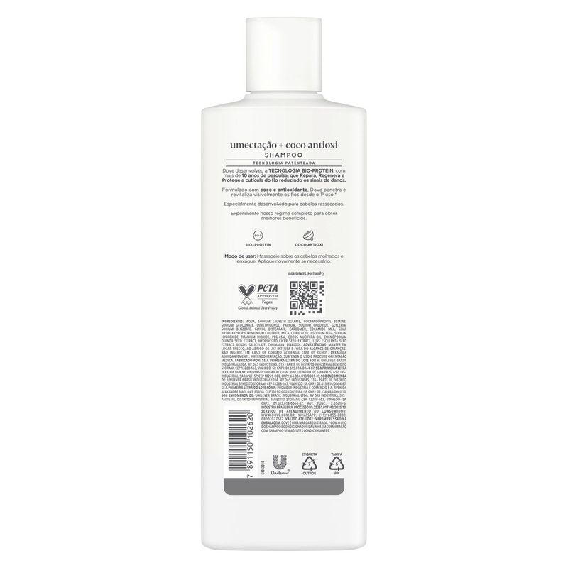 • Dove Shampoo Umectação + Coco Antioxi limpa suavemente e nutre os fios ressecados com óleo de coco e ação antioxidante desde o primeiro uso* • Shampoo nutritivo com óleo de coco que revitaliza os fios, devolve brilho, maciez e ajuda a reduzir os sinais de ressecamento • Com a tecnologia patenteada Umectação + Coco Antioxi e a exclusiva Bio-Protein, repara, regenera e protege a cutícula contra os principais danos capilares* • Dove shampoo para cabelo seco e ressecado é ideal para uso diário, promovendo leveza, hidratação e toque sedoso, mesmo em cabelos mais danificados • Shampoo com ação hidratante, desenvolvido por Dove expert em danos, que limpa sem agredir e prepara os fios para absorver os benefícios do tratamento completo da linha O Dove Shampoo Umectação + Coco Antioxi foi especialmente desenvolvido para oferecer limpeza eficaz e cuidado nutritivo aos cabelos ressecados. Enriquecido com óleo de coco e antioxidantes, limpa sem agredir e ajuda a restaurar o brilho e a maciez natural dos fios, deixando mais leves, hidratados e revitalizados desde o 1° uso*. Com a tecnologia patenteada Umectação + Coco Antioxi, aliada à tecnologia exclusiva Bio-Protein, resultado de mais de 10 anos de pesquisa, o shampoo Dove age profundamente na fibra capilar. Ele repara, regenera e protege a cutícula dos fios contra os principais sinais de danos causados por agressões externas e rotina diária*. Ideal para cabelos secos, opacos ou danificados, pode ser usado diariamente como parte de um cronograma capilar completo, especialmente na fase de nutrição. Dove é expert em danos e oferece soluções que equilibram tratamento profundo com sensorial leve e toque sedoso. *Com o uso do shampoo e condicionador da linha em comparação com shampoo sem agentes condicionantes.